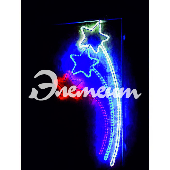 Мотив "Звездный триколор" изготовлен из современного LED дюралайта на жестком металлическом каркасе, окрашенным порошковой краской. Надежность и простота эксплуатации позволяют применять световую консоль в различных температурных и погодных условиях нашей необъятной страны.