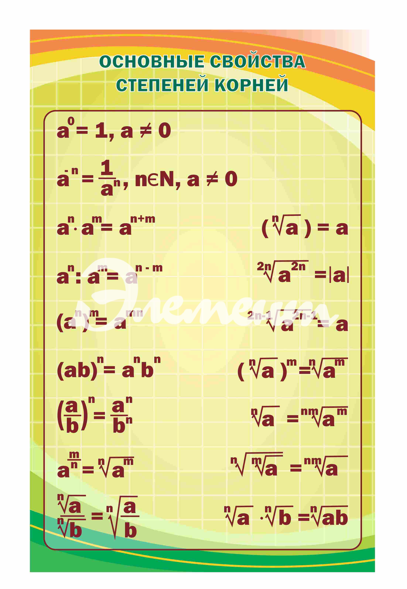 Услуга: Оформление кабинета Математики Основные свойства степеней корней 700х1100мм