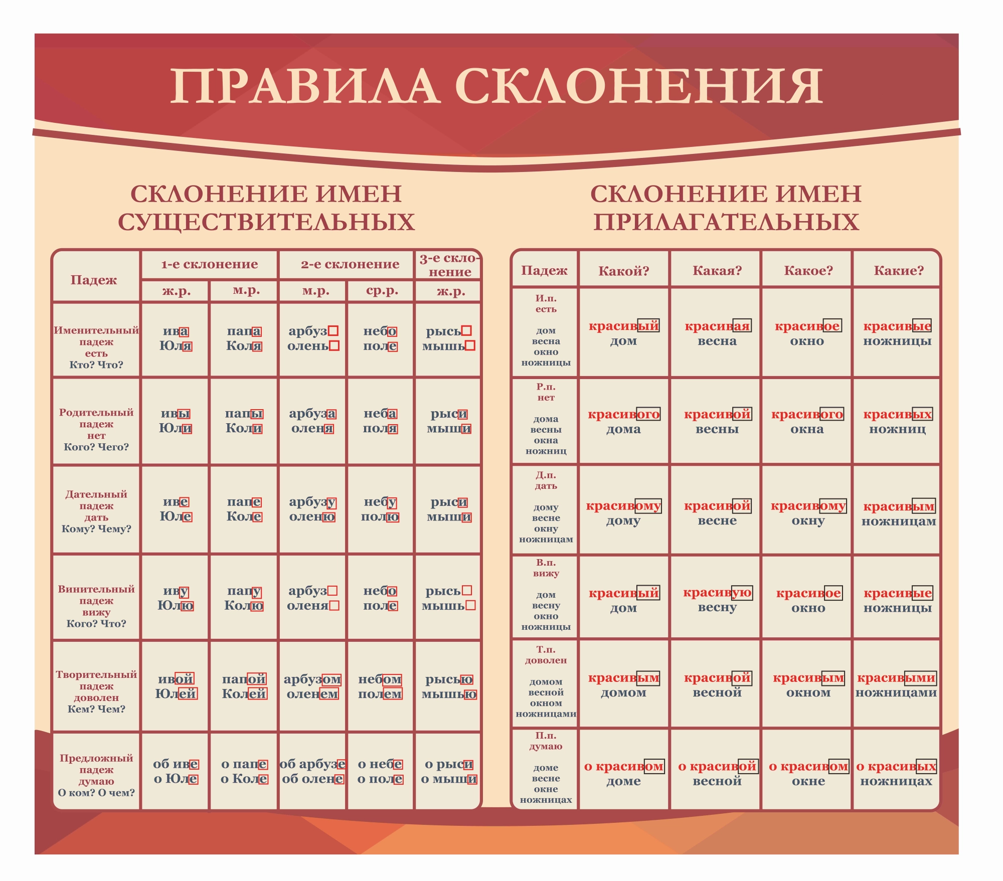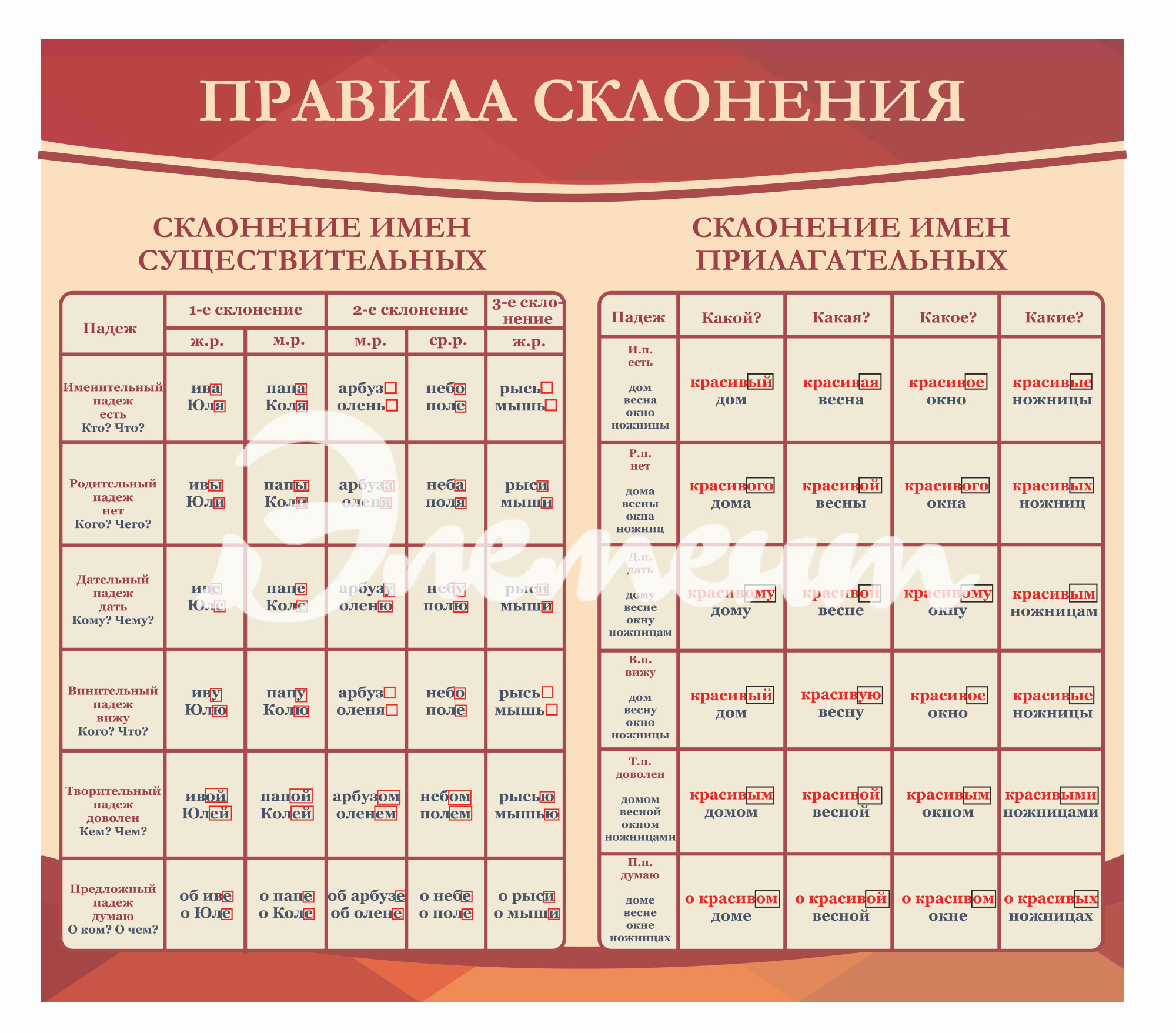 Услуга: Оформление кабинета Русского языка Правила склонения 900х800мм