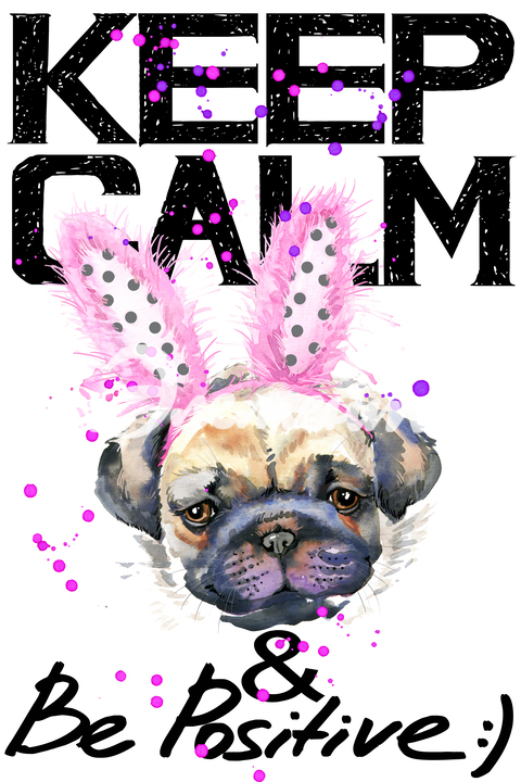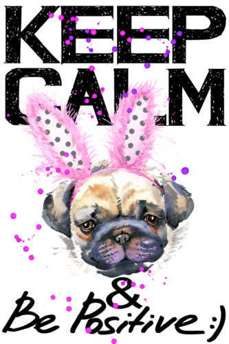 KEEP CALM and Be Positive. Мопс с розовыми заячьими ушками