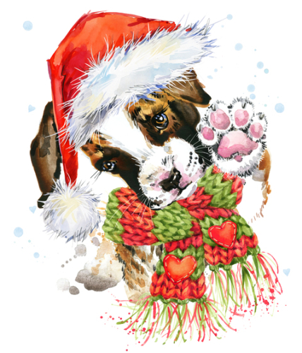 Щеночек в новогоднем шарфике и шапочке подаёт лапку